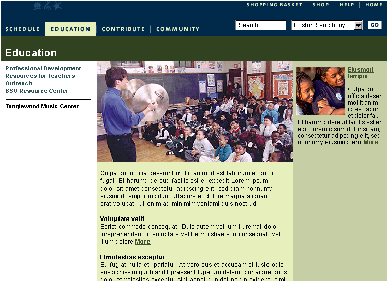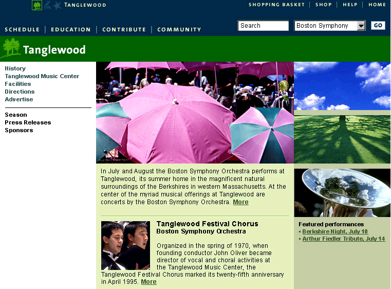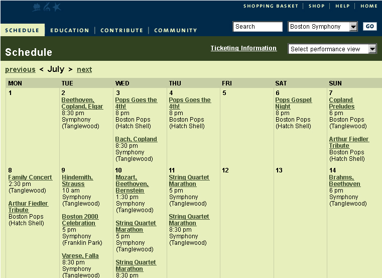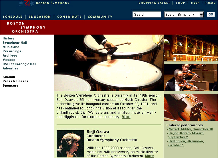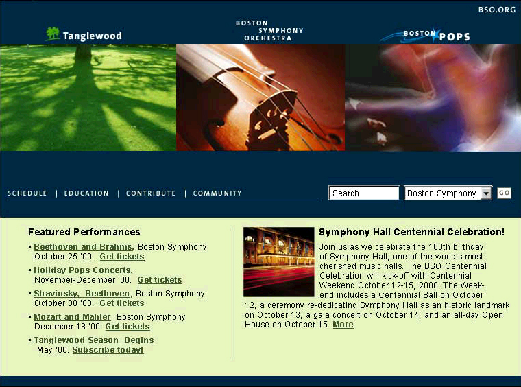 Redesigned bso.org. Boston Symphony Orchestra manages BSO, Tanglewood and Boston Pops. The site needed to pull together the three entities while maintaining the unique differences. Buying tickets, managing seat choice and creating a scalable educational portal were the key drivers for this redesign.