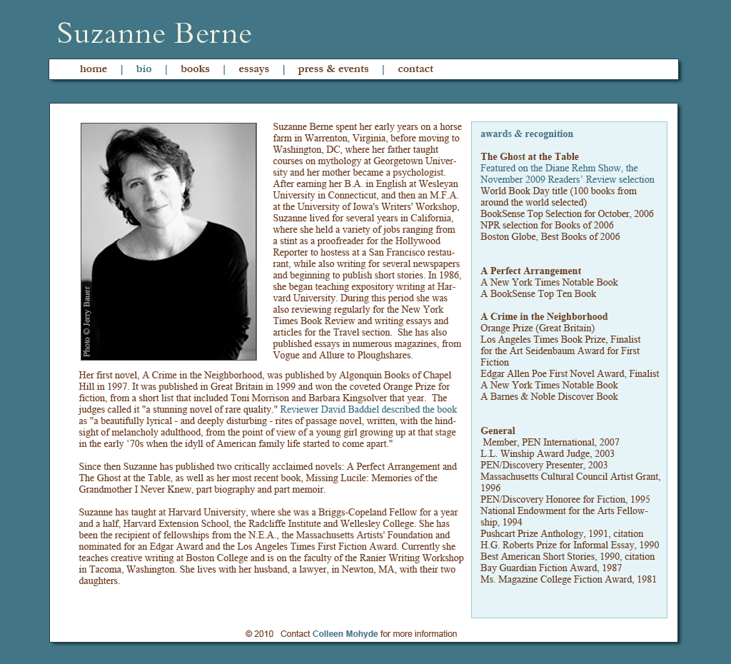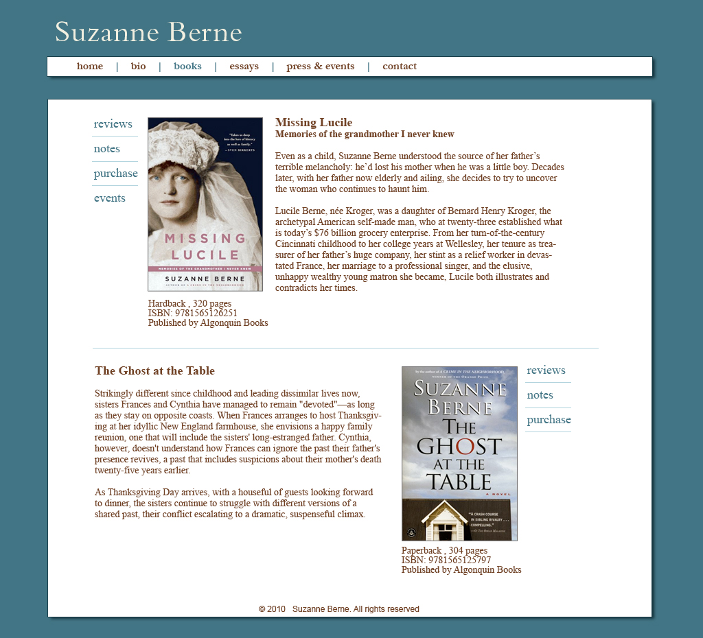 Developed and designed suzanneberne.net. The goal was to make the site scalable with each new book, interview and review. It was built in WordPress so she could update it herself.