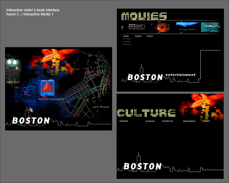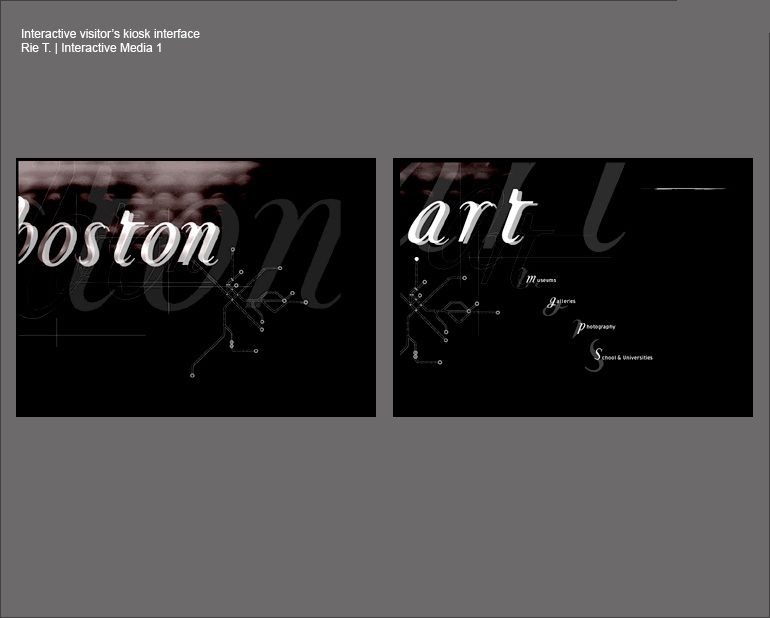 The following are projects done by some of my former students. The projects below represent work from Type in Motion (Poem and/or digital invitation) and an Interaction Design visitor's kiosk interface. Click the thumbnail to see more.